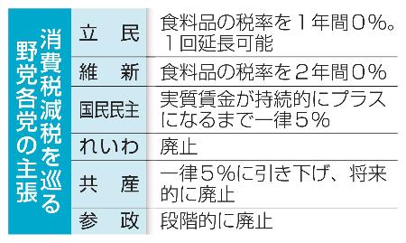 だが消費税に関し、野党各党の溝は深い。立民は1年間、食料品の税率を0%にすると主張。日本維新の会は2年間の食料品税率0%を掲げ、国民民主党は実質賃金が持続的にプラスになるまでの一律5%を訴える。れいわ新選組は廃止、共産党は将来的な廃止を目指して一律5%、参政党は段階的な廃止を求める。