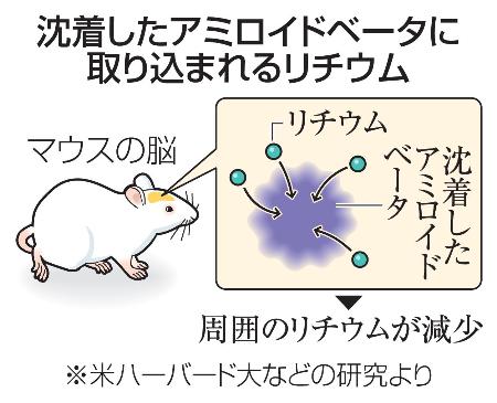 認知症で最も多い「アルツハイマー病」のような状態になりやすいマウスに、金属の一種「リチウム」を飲ませると認知機能の低下が抑えられることが分かったと、米ハーバード大などのチームが17日までに英科学誌ネイチャーに発表した。脳内のリチウムが不足すると記憶力が低下することも確認。新しい治療法の開発につながる可能性がある。