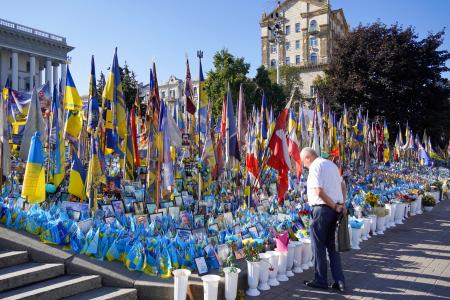 青と黄の国旗が並ぶキーウ中心部の独立広場では、戦死者の遺影に多くの人が祈りをささげていた。近郊から訪れたセルギー・オルロフさん(62)はウクライナ東部の戦場で親族を亡くした。ロシアとの領土交渉を迫られる可能性もあるが「平和のためには一時的な占領の受け入れはやむを得ない」と語った。
