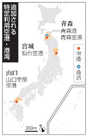 追加されるのは青森県の青森空港と青森港、宮城県の仙台空港、山口県の山口宇部空港。政府は自衛隊と海保のニーズを踏まえ、施設管理者との調整を進める。
