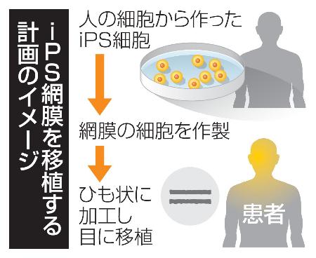 計画では、光を感知する機能の維持に関わる「網膜色素上皮細胞」を健康な人のiPS細胞から作製。細胞の塊をひも状に加工し「網膜色素上皮不全症」の成人患者15人に移植するとしていた。