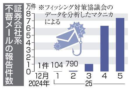 証券会社系の偽サイトに誘導し、IDやパスワードを盗もうとする不審なメールについての報告事例が、昨年12月の1件から今年に入って急増し、5月末までに14万件を超えたことが26日、分かった。フィッシング対策協議会にユーザーや事業者から報告のあったデータについて、サイバーセキュリティー事業を手がける「マクニカ」(横浜市)が分析した。