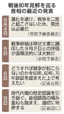 首相は終戦の日の8月15日、戦後50年の1995年から10年ごとに続いてきた閣議決定による「首相談話」を出さなかった。一方、自身の見解表明に関し「歴代内閣の歴史認識を引き継ぐ。首相談話の積み重ねも踏まえ、適切に判断する」と説明していた。政府関係者は「9月2日の表明は想定していない。まだ検討すべき事項がある」と話した。