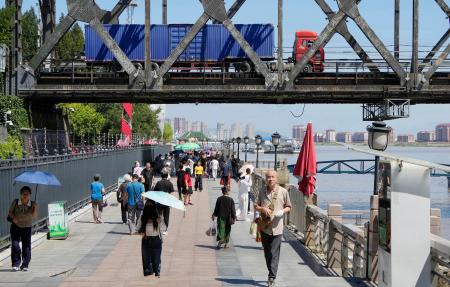 国境沿いを流れる鴨緑江の「中朝友誼橋」周辺は29日、記念写真を撮る観光客らでにぎわっており厳戒態勢には至っていない。