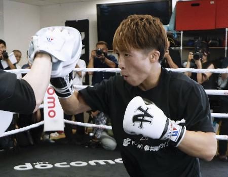 5度目の4団体王座防衛を懸け、世界ボクシング協会(WBA)同級暫定王者のムロジョン・アフマダリエフ(ウズベキスタン)と闘う。この日はミット打ちで鋭いワンツーを披露し、順調な調整ぶりをうかがわせた。