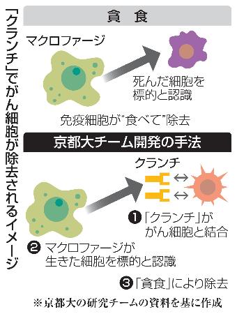体内に蓄積されると、がんなど病気の原因になる不要な細胞の除去を効率化するタンパク質「クランチ」を開発したと、京都大の研究チームが3日、英科学誌に発表した。マウス実験で確認した。がんや、誤って正常な細胞を攻撃する自己免疫疾患などの新たな治療法につながると期待できるという。