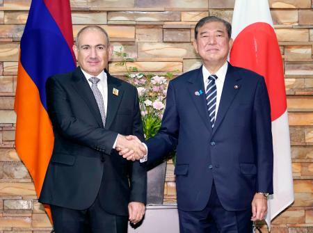 石破茂首相は4日、アルメニアのパシニャン首相と官邸で会談し、両国関係を強化する方針を確認した。「法の支配に基づく自由で開かれた国際秩序の維持、強化に向け共に取り組む重要なパートナーだ」と強調。アルメニアとアゼルバイジャンが、米国の仲介で和平に向けた指針となる共同宣言に署名したことを歓迎し「恒久的な平和と繁栄を期待する」と述べた。