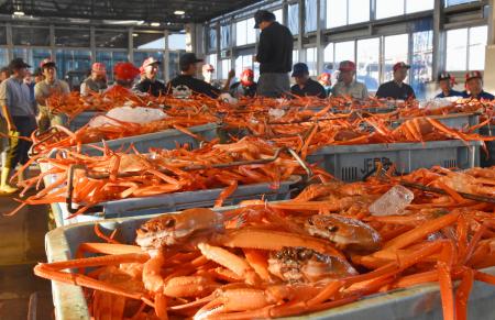 漁は1日から解禁となっており、境港から8隻が日本海で操業していた。6日は572箱(1箱36キロ)が水揚げされ、午前7時から初競りが行われた。姿売り用は30キロ当たり8万9千円で落札。加工用にも2万2500円の値が付いた。競り場には威勢のいいかけ声が響き渡り、かごの中に真っ赤なベニズワイガニが山積みにされ、シーズン到来を告げた。漁期は来年6月末まで。