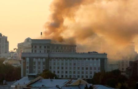 キーウ市当局によると、市内では攻撃で1歳の子どもを含む2人が死亡した。庁舎から煙が立ち上るのを共同通信記者も確認した。