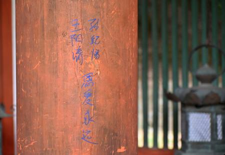 奈良署によると、東回廊にある柱に縦28センチ、横7センチの大きさの落書きが見つかった。人名とみられる漢字のような青色の文字が10文字ほど書かれていた。本殿北東側の柱にも2行にわたる漢字のような落書きがあった。署が文化財保護法違反などの疑いで調べている。
