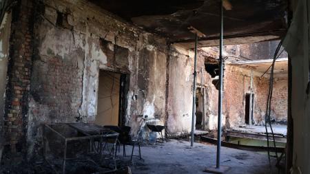 【キーウ共同】ロシアによる7日の攻撃で損傷したウクライナ首都キーウにある政府庁舎の内部が10日、共同通信など国外のメディアに公開された。石造りの壁には大きな穴が開き、天井や床が抜け鉄筋や配線がむき出しに。机や椅子は真っ黒になり、焦げた臭いが漂っていた。