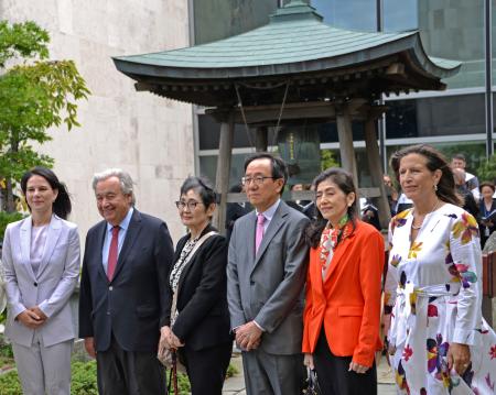 平和の鐘は、太平洋戦争で多くの戦友を失い、後に愛媛県宇和島市長を務めた故中川千代治さんが1954年、国連本部に寄贈した。式典でグテレス氏と共に鐘を鳴らした中川さんの娘高瀬聖子さん(77)は「父の平和への願いを込めた」と述べた。