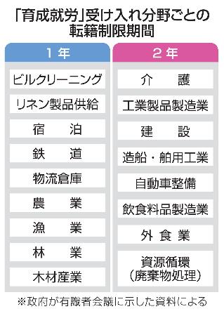 案によると、2年とする8分野は建設や外食業などで、必要な技能や専門的知識を習得するのに一定期間を要すると判断した。受け入れ先は、2年目に移行する際に原則として昇給が義務付けられる。