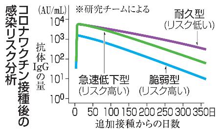 その結果、追加接種後の血中に抗体の免疫グロブリンGが多く長期間残る「耐久型」、抗体が少なく減少が早い「脆弱型」、抗体は多いが早期に減少する「急速低下型」の三つの特徴的なパターンがあることが分かった。