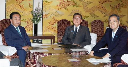 会談には、石破茂首相(自民総裁)、公明の斉藤鉄夫代表、立民の野田佳彦代表が出席。首相は会談で、社会保障制度の将来像を議論するため「問題意識を共有する他の政党にも幅広く呼びかけたい」と述べた。