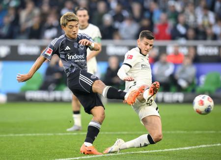 【メンヘングラッドバッハ(ドイツ)共同】サッカーのドイツ1部リーグで27日、アイントラハト・フランクフルトの堂安律はアウェーのボルシアMG戦で前半に2アシストをマークし、6―4の勝利に貢献した。後半26分に退いた。ボルシアMGの町野修斗は後半16分までプレーした。