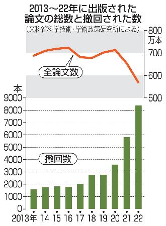 一度出版した論文が研究の不正や不備で取り消される「撤回」が、2022年までの10年間で5倍以上に増えたことが5日までに、文部科学省科学技術・学術政策研究所のまとめで分かった。自然科学や人文・社会科学の論文撤回事例、約3万2千件を分析した。研究の中核となった著者の国別では中国が過半数を占め最多、インドと米国が続いた。