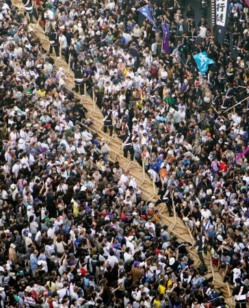 平和を願い長さ160メートル、重さ35トンの世界最大級の大綱を引き合う沖縄県の伝統行事「那覇大綱挽」が12日、那覇市中心部で行われた。琉球王国時代の1450年ごろに始まったとされ、1997年に当時の世界一の大綱としてギネスブックに認定。国内外から集まった多くの引き手や見物客が会場の国道58号を埋め尽くし、街は熱気に包まれた。