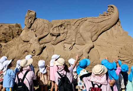 国内外の砂像彫刻家らが約1カ月かけて制作。企画立案などで中心的な役割を担ったプロデューサーの茶円勝彦さん(64)は「世界トップクラスの彫刻の迫力と精巧さを味わって」とPRした。展示は11月9日まで。