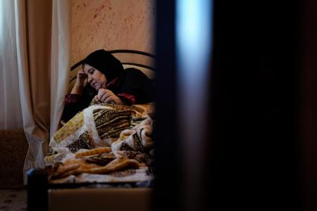 自治区ラマラ近くのムガイヤ村。10月27日、農家アファフ・アブアリアさん(55)が自宅で横たわったまま見舞客にあいさつしていた。「全身にあざが残って、どの体勢でもつらい」という。