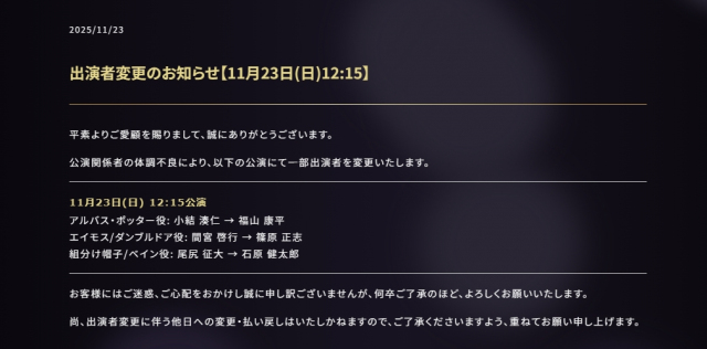 23日の午後0時15分公演について、アルバス・ポッター役::小結湊仁→福山康平、エイモス/ダンブルドア役:間宮啓行→篠原正志、組分け帽子/ベイン役:尾尻征大→石原健太郎への変更を伝えた。