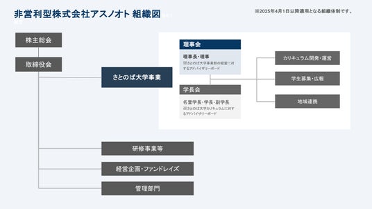 さとのば大学は株式会社アスノオト内のメイン事業として運営しておりますが、大学運営機能をさらに強化していくため、「さとのば大学事業」内部にアドバイザリーボードとしての理事会および学長会を設置いたします。
