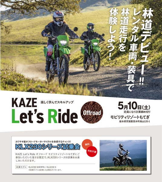 株式会社カワサキモータースジャパン(本社:兵庫県明石市、代表取締役社長:佐伯 健児)は、林道体験イベント「KAZE Let’s Ride オフロード モビリティリゾートもてぎ」を開催します。