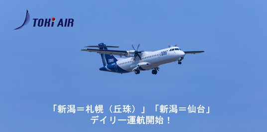 URL:https://tokiair.com/トキエアは「革新的なモビリティサービスを通じて地域産業の活性化を目指す 」をビジョンに掲げ、2020年に創業した新潟拠点の地域航空会社です。地球環境にやさしく脱炭素・運航コストを削減するATR 72-600などのプロペラ機を使用し、2024年「新潟=札幌(丘珠)」「新潟=仙台」2路線の運航を開始、人やモノを運ぶことを通じて ビジネス・観光・インバウンドなどあらゆる地域創生に貢献しています。公式SNSで最新情報、キャンペーン情報等も随時発信中
