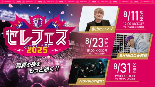 本イベントでは、各試合日に地元大阪にゆかりのあるアーティストをお招きし、ここにしかないエンターテインメント体験をお届けします。8/11(月・祝)アルビレックス新潟戦には、大阪市東住吉区出身のアーティスト 影山ヒロノブさん、8/23(土)ヴィッセル神戸戦には大阪市西成区出身のラッパーSHINGO★西成さん、8/31(日)サンフレッチェ広島戦には、大阪発の 5 人組ロックバンド Novelbright の皆さまにご来場いただく予定です。