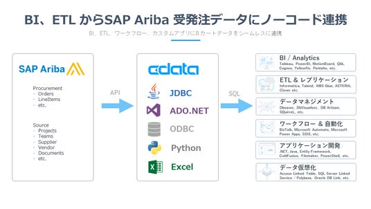2024年6月20日、CData Software Japan 合同会社(本社:アメリカノースカロライナ州、日本オフィス:宮城県仙台市、代表社員 職務執行者:疋田 圭介、以下CData)は、SAP が提供する購買・支出管理サービスのSAP Ariba のデータ連携を拡張する『CData Drivers for SAP Ariba Source』および『CData Drivers for SAP Ariba Procurement』をリリースしました。本製品により、SAP Ariba 内にある受発注データの分析用データウェアハウス(DWH)へのパイプラインや、SAP S/4HANA をはじめとする基幹システムへの連携やBI ツールとの連携をノーコードで実現することができます。CData Drivers for Ariba で広がる受発注データの連携シナリオは以下を含みます。これらのソリューションはパートナーであるビジネスエンジニアリング株式会社(東京都千代田区、代表取締役社長:羽田 雅一、以下B-EN-G)が提供します(B-EN-G プレスリリースはこちら)。