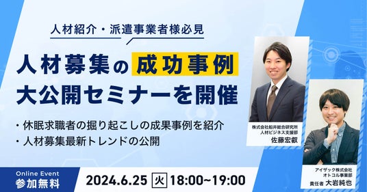 自動電話発信ツール「オトコル」を提供するアイザック株式会社(本社:東京都渋谷区、代表取締役社長 田中 和希)は、株式会社船井総合研究所と共催で「2024年の人材募集における最新トレンドと成功事例」をお伝えする無料セミナーを6月25日に開催します。