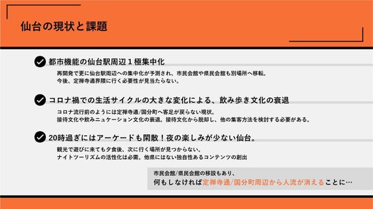 加えて平日夜は、東北一の歓楽街である「国分町」、約1.5kmの長さを誇るアーケードの閑散ぶりは目を覆いたくなる寂しさだ。このような現状を放置すれば、定禅寺通はじめ国分町への人流は消える恐れがある。