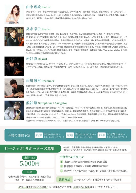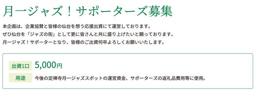 本企画では、仙台をジャズで盛り上げたいと思う個人の皆様からの出資も募っている。