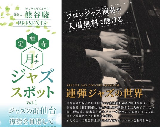仙台出身のサックスプレイヤー熊谷駿が発起人となり、月1回プロによるジャズ演奏が気軽に聴ける機会を創出。音楽が鳴り響く街を目指した取り組みへ繋げる。