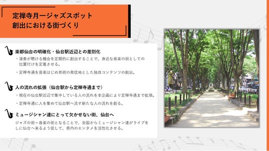 本企画は、仙台が【エンタメ発祥の地】である歴史的な背景より、賑わい創出と「ジャズ」を仙台の観光特色にすることを目指した企画である。
