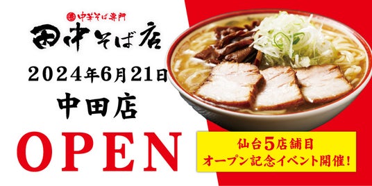 「中華そば専門店 田中そば店」仙台1号店として2010年2月にオープンした「仙台長町店」は大震災や様々な苦難を仙台の皆様をはじめ多くの方々のご支援により乗り越え早14年、ここまで営業できてきたのも、日頃のご愛顧の賜物と感謝しています。この度の「中田店」は仙台市内5店舗目となります、「仙台長町店」を含む他の店舗共々、10年、20年と末長くご愛好いただける一杯を心を込めて提供してまいりますので、皆様のご来店心よりお待ちしております。