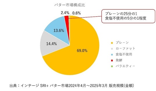 発酵バターの市場構成比は、プレーンの25 分の1 で、食塩不使用の5 分の1 程度。