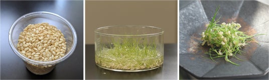 (左)玄米 (中央)発芽した玄米スプラウト (右)玄米スプラウト