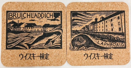 ブルックラディ蒸留所とラフロイグ蒸留所をモチーフにしたコルクコースター。どちらが届くかはお楽しみ。