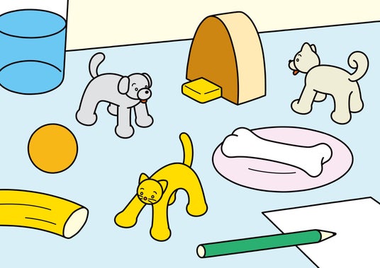 左から「DOG A」(ブチ)、「CAT」(黄)、「DOG B」(茶柴)