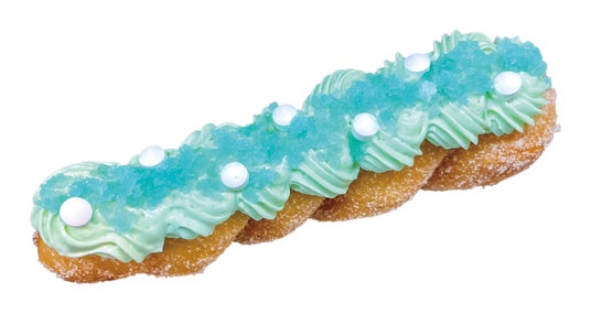 トッピングのクリームには、ラムネシロップとほんのりレモンシロップをブレンドし、清涼感をプラス。さらに、鮮やかな青色のラムネ風味シュガーをかけ、仕上げにラムネ菓子をトッピングしました。