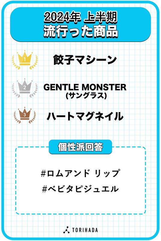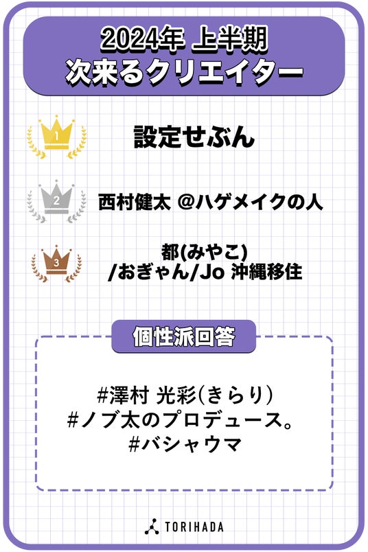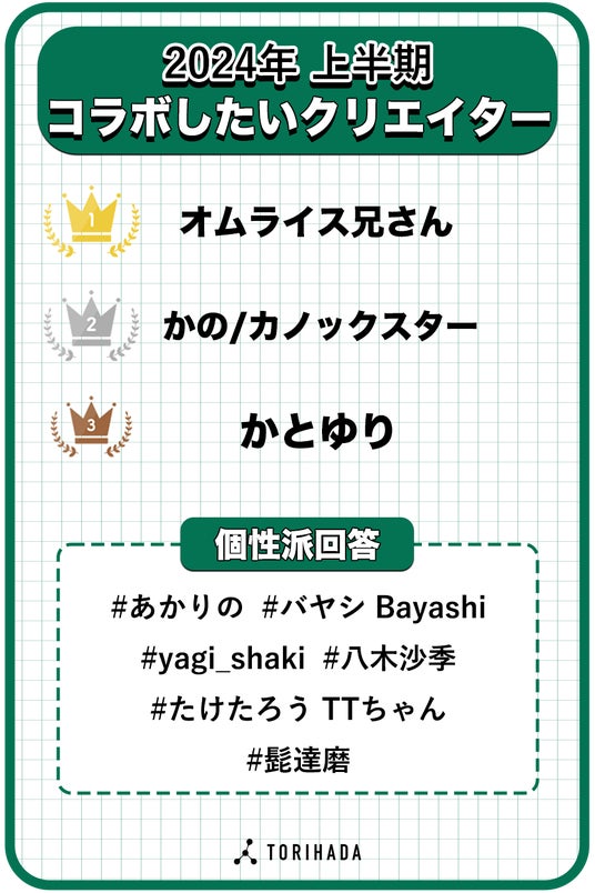 「TikTokクリエイターが選ぶ!流行ランキング2024上半期」は、TikTokを中心に活躍している動画クリエイター約1,000人に向けて2024年6月にアンケート調査を実施。クリエイター目線から2024年にTikTokで流行ったもの・ことについてアンケート回答を集計しました。TORIHADAは、ショートムービーを活用したマーケティングにより企業のニーズに対応し、同時にクリエイターのマネジメントを行うことで個人経済の構築を目指す企業です。今回のアンケートではクリエイター事務所「PPP STUDIO」に所属または提携のあるクリエイターを対象に調査を行うことでオリジナルのアンケート結果となっています。