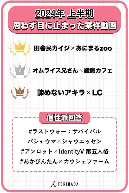 本ランキングは昨年発表した「TikTokクリエイターが選ぶ!!流行ランキング2023」の第二弾として実施。子会社にクリエイター事務所のPPP STUDIO(ピピピスタジオ)を抱え、ショートムービーマーケティング業界を盛り上げるべく密に連携しているTORIHADAが、日々ショート動画に向き合うクリエイターに向けてアンケートを実施したもので、トレンドに敏感なインフルエンサーのリアルな声を集計いたしました。