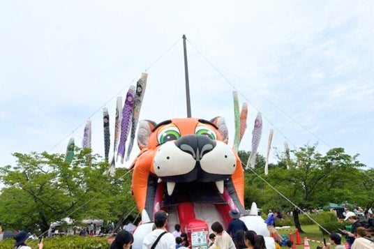 イベント当日は、バラの小径周辺にキッチンカーなど30店舗以上の店舗が出店していました。芝生広場には、お子様は無料で遊ぶことができる大型エアー遊具も設置され、行列ができるほどの賑わいでした。