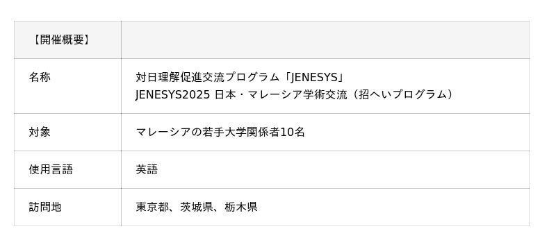 外務省が推進する対日理解促進交流プログラム「JENESYS」の一環として、マレーシアの若手大学関係者10名が下記の日程で東京都、茨城県、栃木県を訪問します。