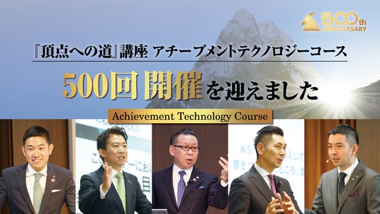 『頂点への道』講座アチーブメントテクノロジーコースは、2013年に宮城県仙台市にて第1回を開催。開講以来、全国各地で開催され約12年間でその開催数は500回に達し、本コース単体での新規受講生は28,000名を超えました。本コースを含む『頂点への道』講座シリーズにおいては、1992年の開講以来、累計開催数1,200回以上、新規受講生は70,000名を突破しました。
