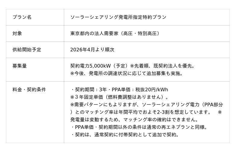 本プランは東京都の助成のもと、関東エリアを中心に農家や農業法人が新規開発する地域と共生した優良なソーラーシェアリング発電所から再エネ電力を調達し、都内の法人需要家に特約プランとして3年間固定価格で供給するものです。