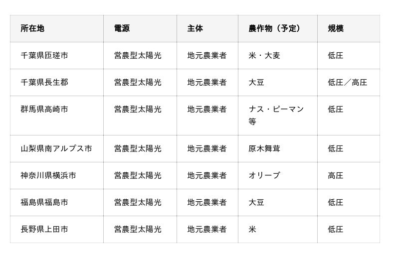 本プランでマッチングするソーラーシェアリング発電所は、関東エリアを中心として、真剣に農業に取り組む事業者のみを対象としています。現在、対象となる発電所を募集・選定中で、最も早いものは2026年春に発電を開始し、その後も順次対象発電所は追加予定です。対象発電所一覧(予定)