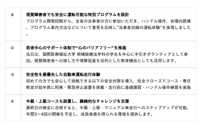 本企画は、視覚障害者が“自ら運転する”という夢の実現を支えると同時に、運転席の視点から交通安全を学ぶ機会を提供することで、「交通事故ゼロ」への理解促進を目指す取り組みです。対象は日本介護トラベルサービスの旅倶楽部会員に限定し、初開催となる今回は初級コースを実施します。