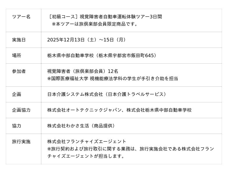 日本介護システム株式会社(代表取締役社長:大友俊雄)、株式会社オートテクニックジャパン、株式会社栃木県中部自動車学校の3社は、視覚障害のある方が安全に自動車運転を体験できる特別プログラム「視覚障害者 自動車運転体験ツアー」を共同企画し、2025年12月13日(土)より栃木県中部自動車学校にて実施いたします。